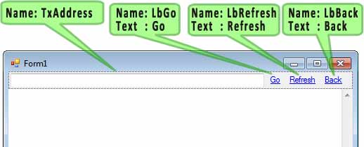 Buatlah projek anda dengan nama terserah, lalu masukan control ‘WebBrowser’ ke dalam form design anda, perhatikan gambar:
